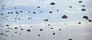 次々にパラシュート降下していく3万5000人の空挺部隊。