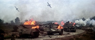 紫色の煙幕をたてて援護を要請、飛行機が空から戦車を一掃…ここの映像も大迫力!!